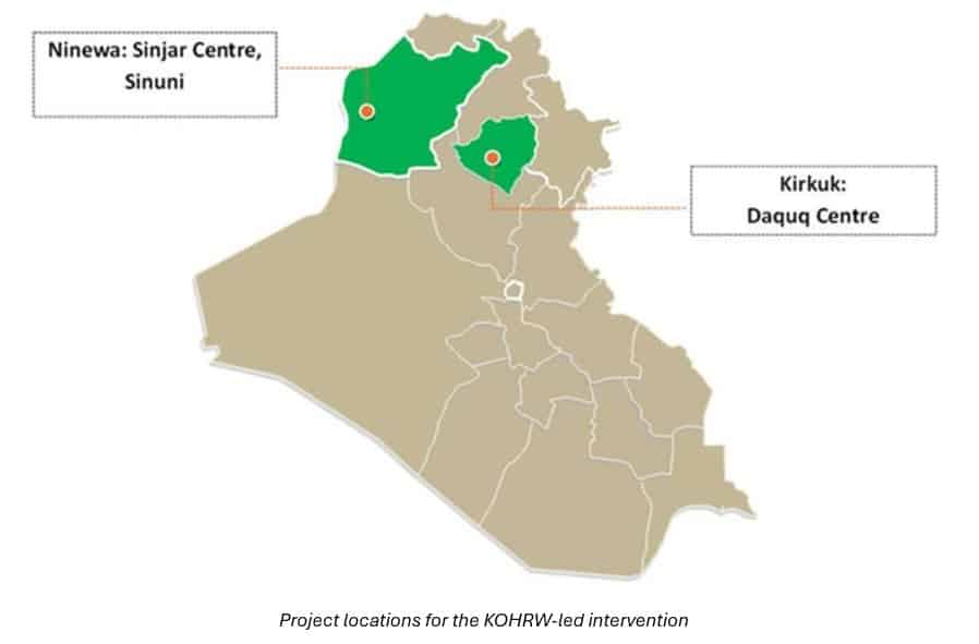 The second project, led by Kurdistan Organization for Human Rights Watch (KOHRW) together with Peace and Freedom Organization and Accepting Others Organization, will be implemented in Sinjar and Daquq. Building for Peace through Inclusive Service Delivery and Accountable Local Governance in Sinjar and Daquq responds to contexts where the legacy of conflict, unresolved trauma, and perceptions of unequal access to services continue to shape relations between communities and authorities. By combining dialogue, conflict-sensitive improvements to water, health, and education services, and strengthened community-authority engagement, the project seeks to support visible, shared benefits while helping rebuild trust and cooperation in areas affected by conflict and displacement.